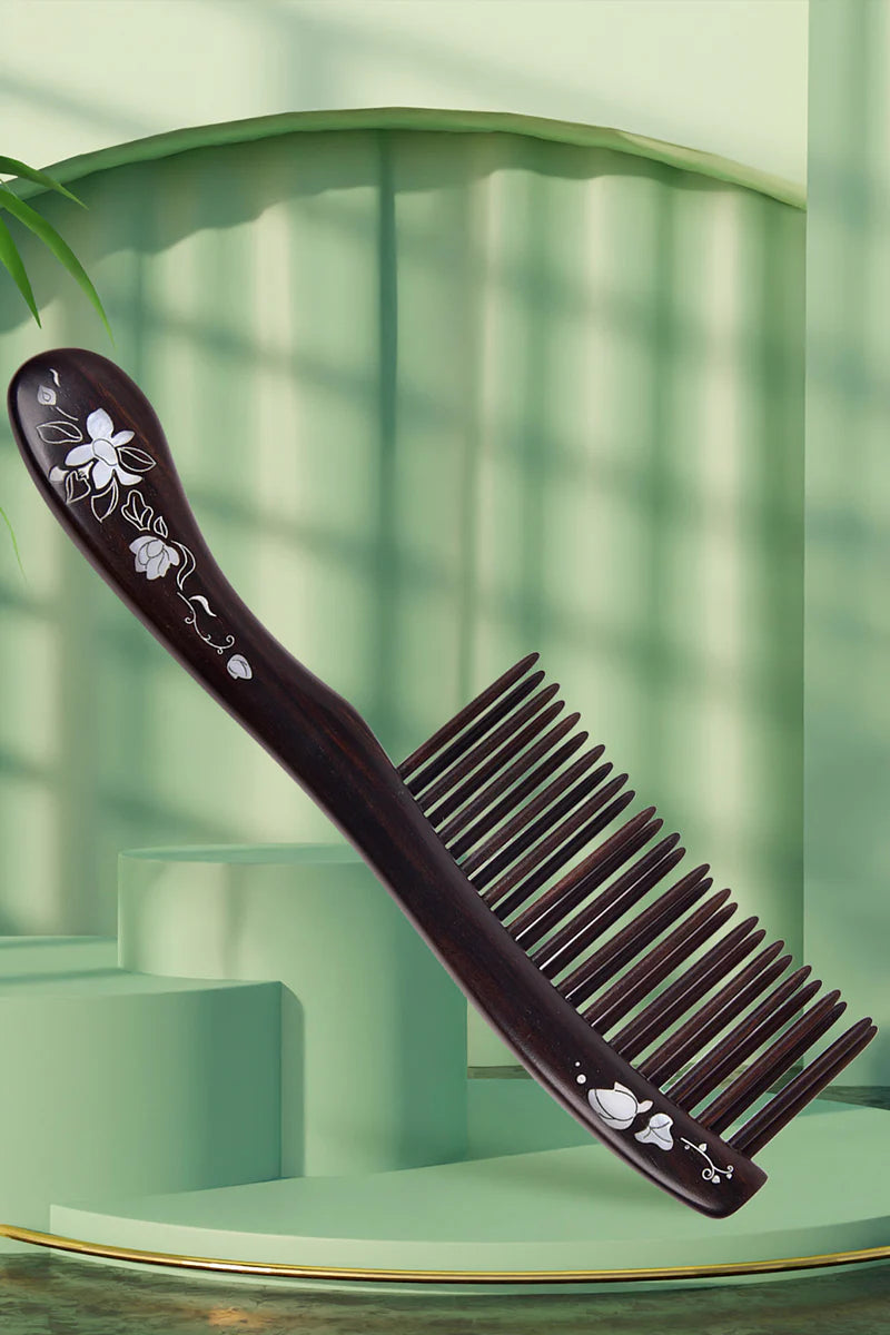 TOOTH-INSERTED WOODEN COMB WITH SEASHELL DECORATION